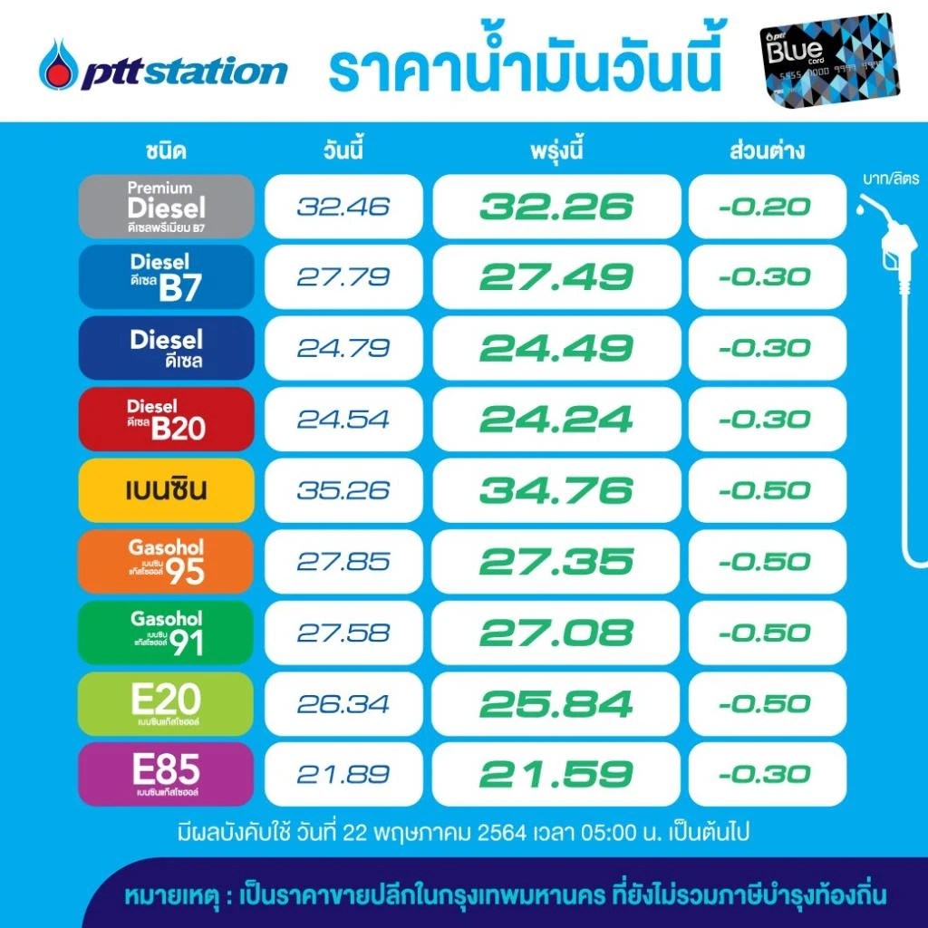 บริษัท ปตท.จำกัด (มหาชน) ประกาศปรับลดราคาน้ำมันทุกชนิดลง 50 สตางค์ต่อลิตร ยกเว้นอี 85 ปรับลดลง 30 สตางค์ต่อลิตร มีผลตั้งแต่วันนี้ (29 พ.